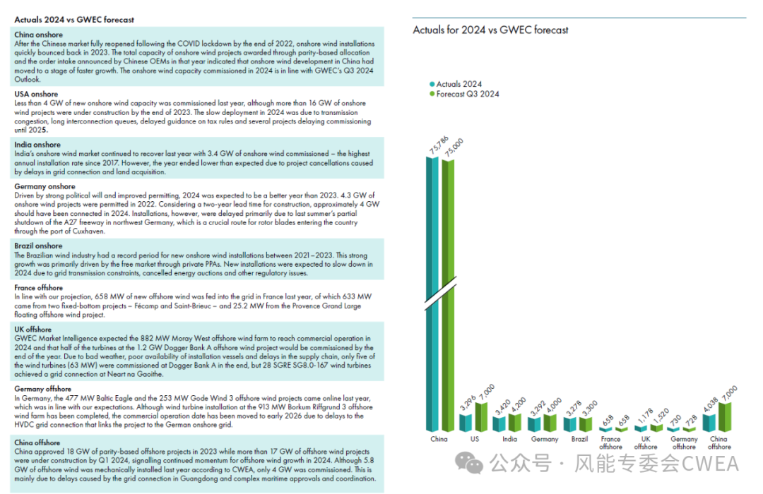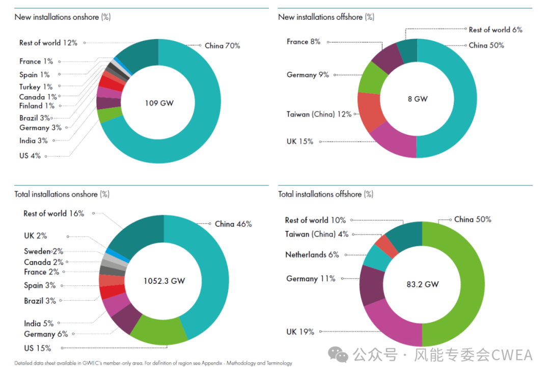 2024年,中国的新增装机继续在全球领先,其次是美国和德国,印度与巴西也位居前五。截至2024年底,这五个市场也是全球累积风电装机量的前五名,巴西在去年超过了西班牙。