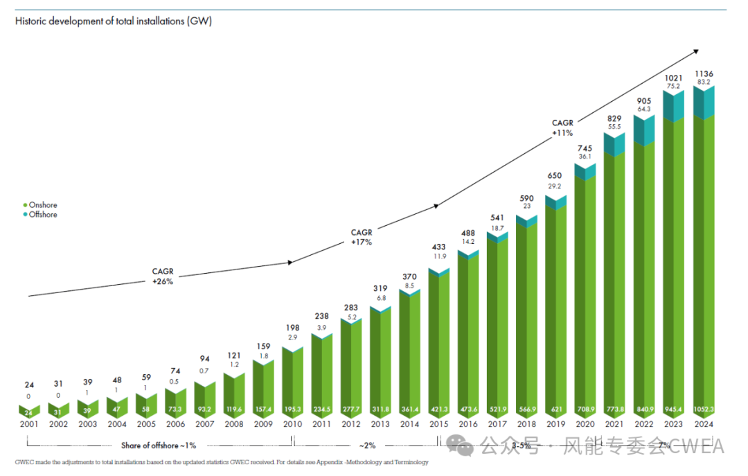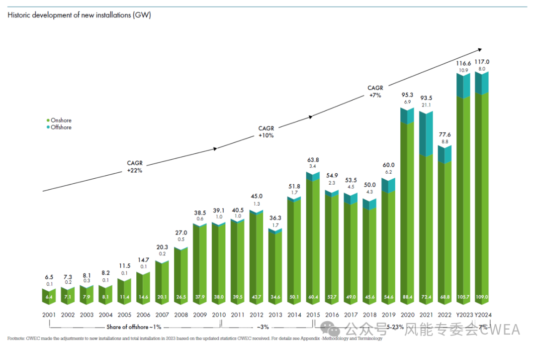 2025年4月23日,全球风能理事会(GWEC)在伦敦发布的《2025全球风能报告》显示,2024年是新增装机创纪录的一年,全球新增风电并网装机容量为117GW。