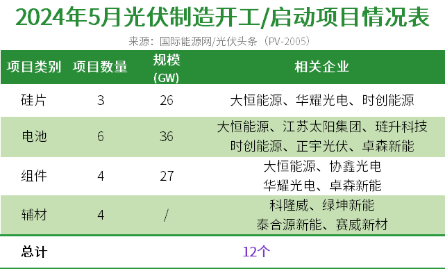 据/光伏头条(PV-2005)统计,5月光伏制造业开工/启动项目为12个,其中6个项目宣布开工,另外6个项目为环评或者项目审批。12个项目中包括6个光伏电池、4个光伏组件、3个光伏硅片以及4个光伏设备、光伏玻璃、光伏银粉、光伏支架等辅材项目。