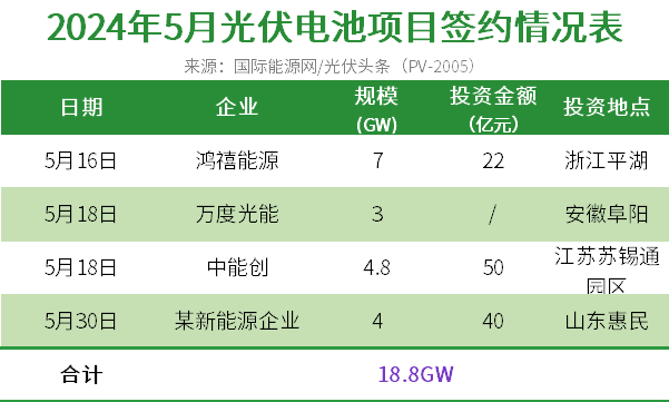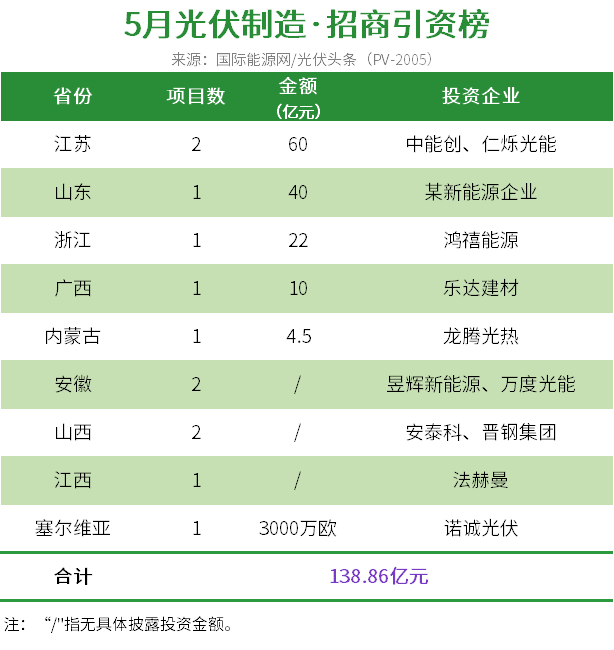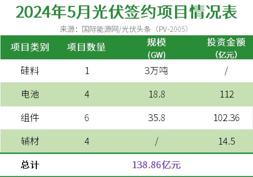 据/光伏头条(PV-2005)统计,进入5月以后,总计12个光伏制造业项目签约,新增投资金额138.86亿元!