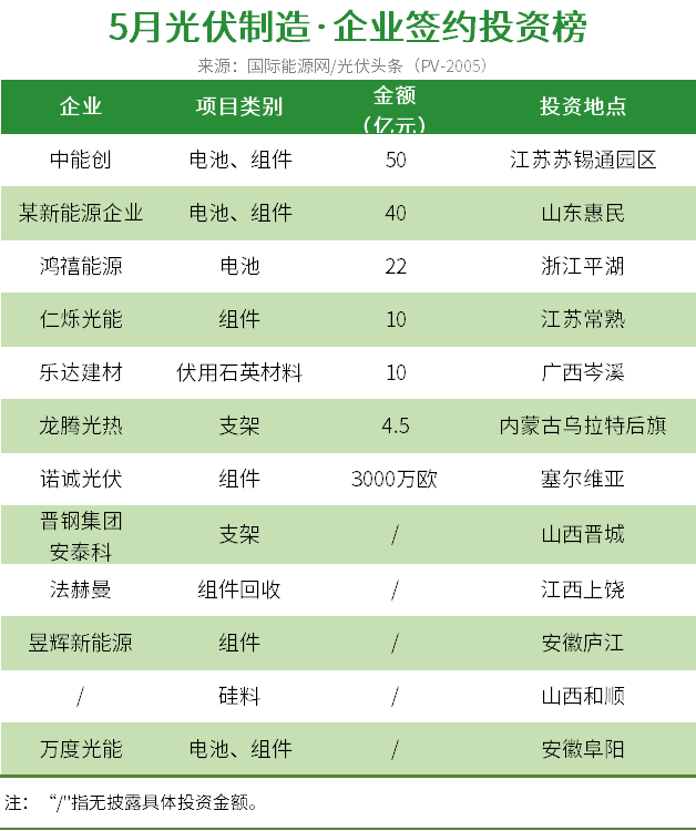 5月光伏制造业有一个明确的信号,行业龙头企业停止新项目签约。二三线企业则配合地方招商引资政策,签约若干项目。