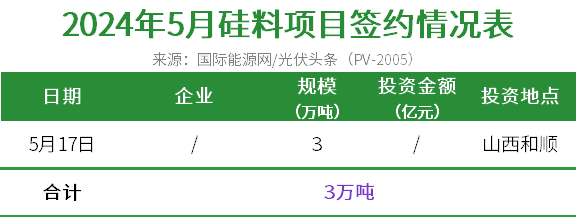 据/光伏头条(PV-2005)统计,5月签约硅料项目为山西和顺县的3万吨光伏级硅料及电子级高纯石英砂新材料加工生产项目。该项目仅披露签约,并未公示相关投资企业与投资金额。