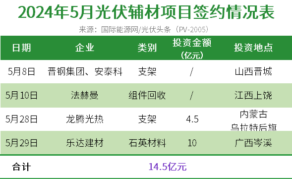 据/光伏头条(PV-2005)统计,5月有4个光伏辅材项目签约,合计新增投资14.5亿元,涉及企业包括晋钢集团、安泰科、法赫曼、龙腾光热、乐达建材。