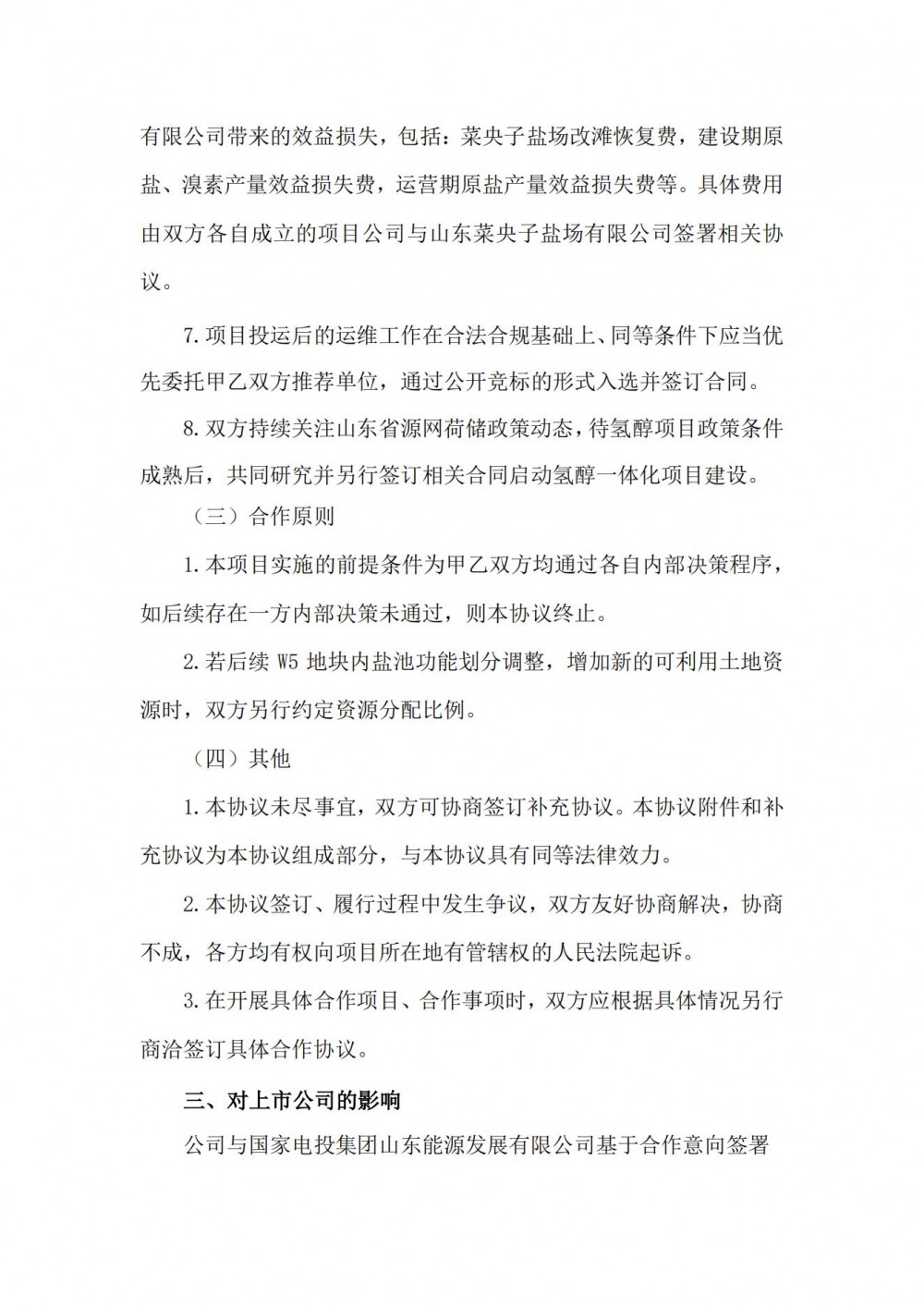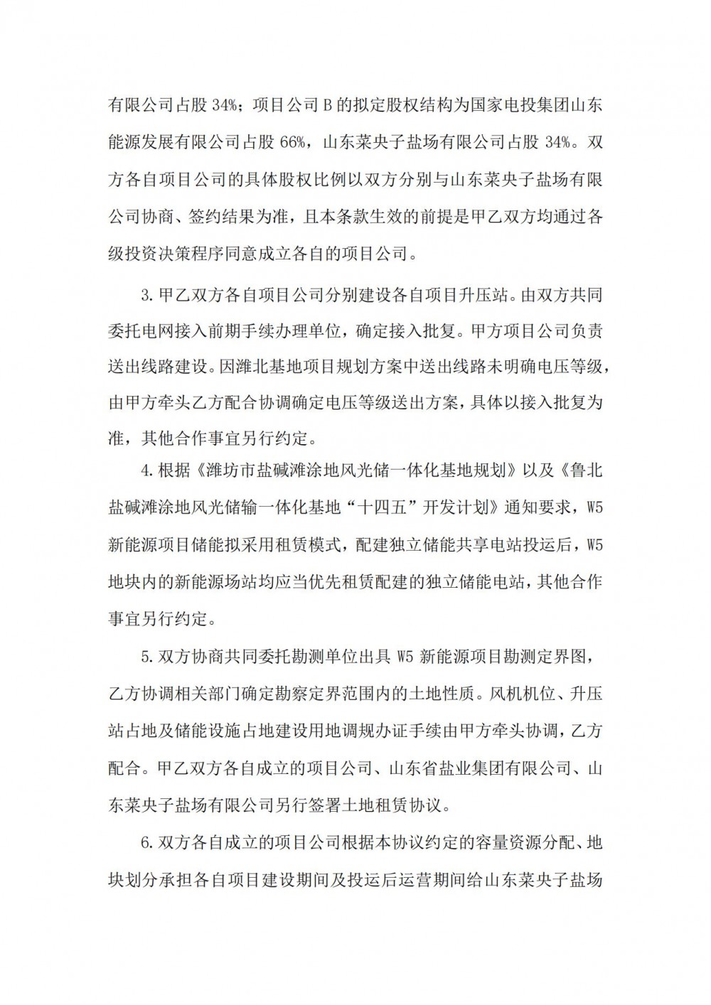 依据山东省能源局文件,双方组成联合体通过竞配申报取得鲁北盐碱滩涂地风光储输一体化基地W5地块项目(以下简称W5新能源项目)的开发权。经双方协商一致签订本协议,拟在W5地块共同开展集新能源开发、盐田改造、溴素综合利用、氢醇生产为一体的绿色低碳循环经济项目建设。