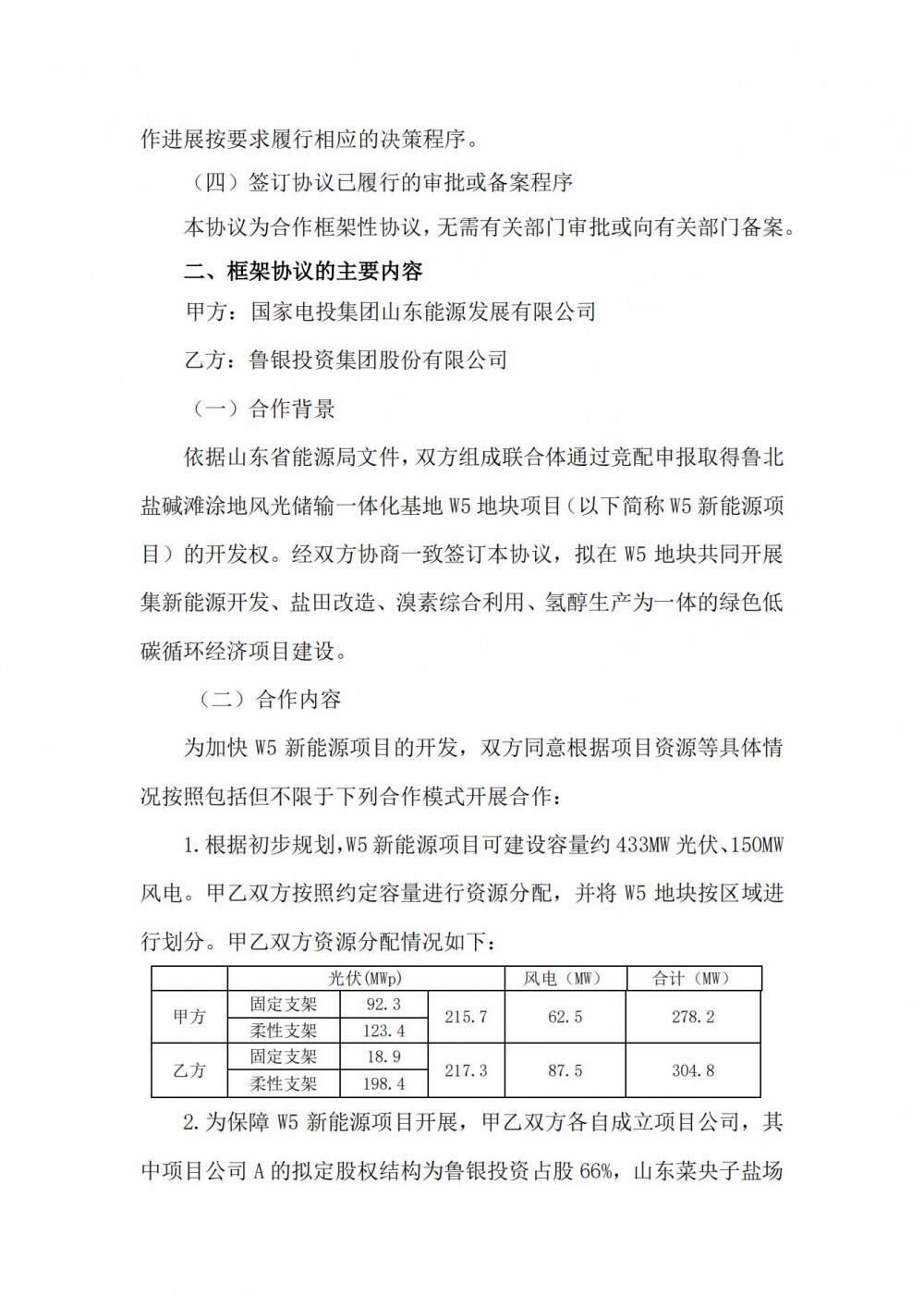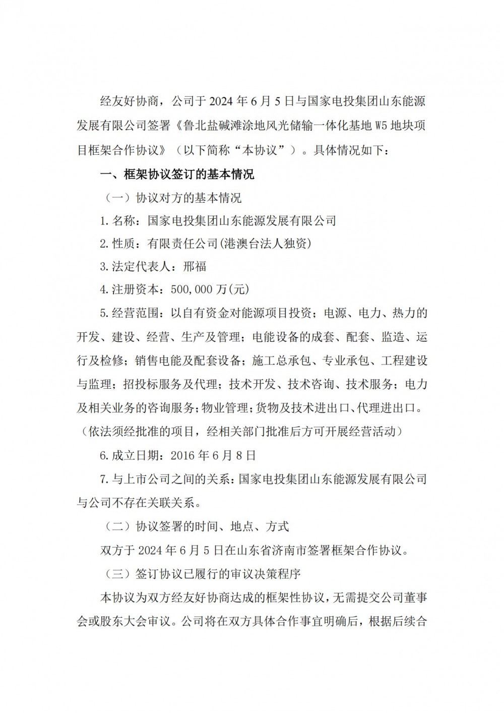 公告表示,经友好协商,公司于2024年6月5日与国家电投集团山东能源发展有限公司签署《鲁北盐碱滩涂地风光储输一体化基地W5地块项目框架合作协议》。
