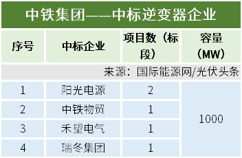 本统计周期,中铁集团有两个项目定标,确定规模1000MW,阳光电源,中铁物贸集团西安有限公司、禾望电气、瑞冬集团股份有限公司拟中标。