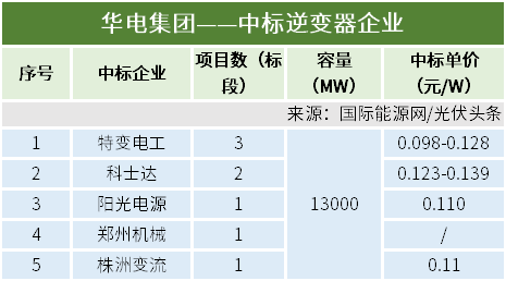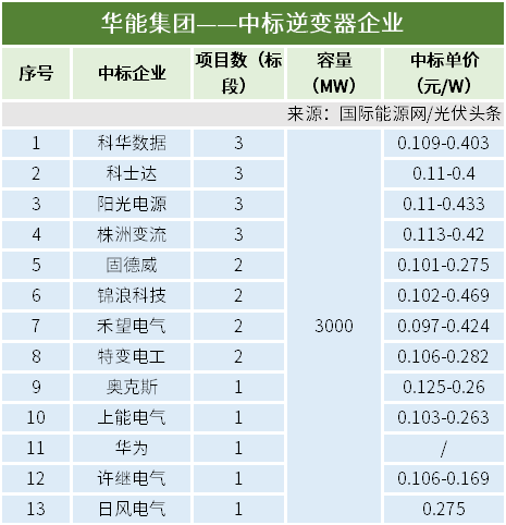 采购企业方面,华电、华能、中国绿发、电建、中铁集团、国家电投、华润、中核、南方电网、中广核等10家央企均有逆变器采购项目定标。