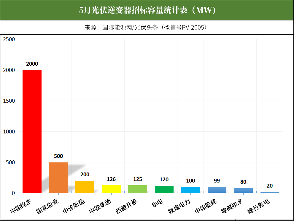 /光伏头条(PV-2005)统计,相比中标市场,5月招标市场相对冷清。中国绿发、国家能源集团、国机集团、中铁集团、华电、陕煤、中国能建等企业发布了21个招标项目,合计容量约3.42GW。