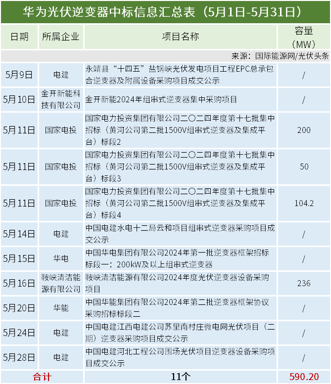 本统计周期,华为中标电建、金开新能、国家电投、鞍峡清洁能源、华能等企业11个项目(标段),合计容量590.2MW。