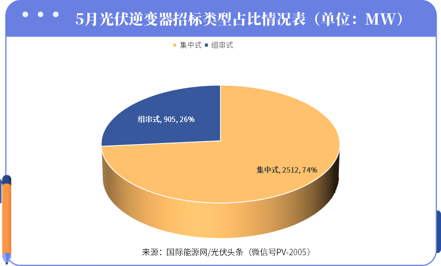 设备要求方面,/光伏头条(PV-2005)统计数据显示,本统计周期组串式逆变器采购容量905MW,占比26%。集中式逆变器采购容量2512MW,占比为74%。