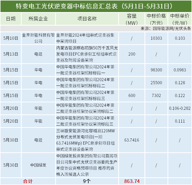 其中,5月15日,中国华电集团有限公司2024年第一批逆变器框架招标项目确定了最终中标人。特变电工、科士达、阳光电源、郑州机械、株洲变流等5家企业成为最大赢家。
