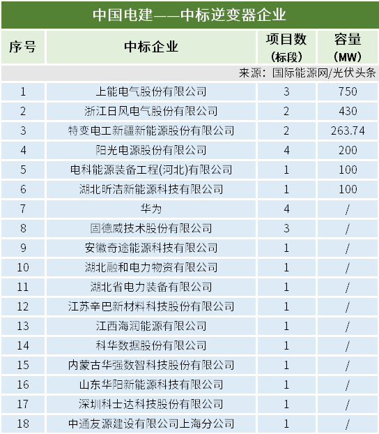 中国电建5月有30个项目定标,合计容量1843.7416MW。上能电气、日风电气、特变电工、阳光电源、华为、固德威、科华数据、科士达等18家企业中标,详情如下: