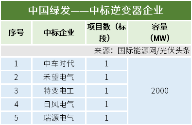 本统计周期,中国绿发投资集团有限公司直属项目公司集中式光伏逆变器委托生产年度协议资格预审项目。该项目容量2GW,株洲中车时代电气股份有限公司、深圳市禾望科技有限公司、特变电工新疆新能源股份有限公司、浙江日风电气股份有限公司、天津瑞源电气有限公司等5家企业中标。