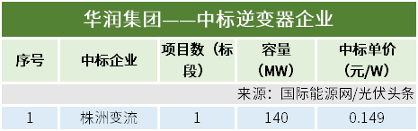 本统计周期,华润集团的内蒙古磴口金牛煤电有限公司火电灵活性改造消纳140MW光伏项目35kV箱逆变一体机设备采购,确定中标人,株洲变流最终中标,中标单价0.149元/W。