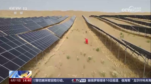 6月11日,央视《朝闻天下》《新闻直播间》等栏目以走进塔克拉玛干沙漠腹地最大光伏电站为题,关注报道了中国电建承建且并网运行满一年的新疆塔中西部且末县10万千瓦光伏项目。