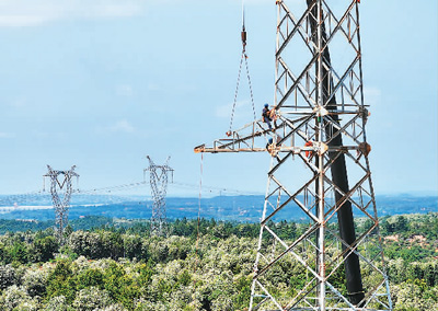 江西500千伏吉安南输变电工程是江西省重点工程,投运后可加强该省吉安市南部电网与吉安主网联络,提升新能源电力消纳能力。图为日前在该项目施工现场,电力工人正在高空进行输电铁塔架设安装作业。