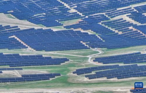 6月11日拍摄的由中建二局承建的中国绿发尼勒克400万千瓦风电光伏项目(无人机照片)。