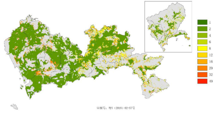 图:深圳市(含深汕地区)水平总辐射年总量1100kWh/m2以上等级光伏装机密度系数分布图(单位:MW/km2)