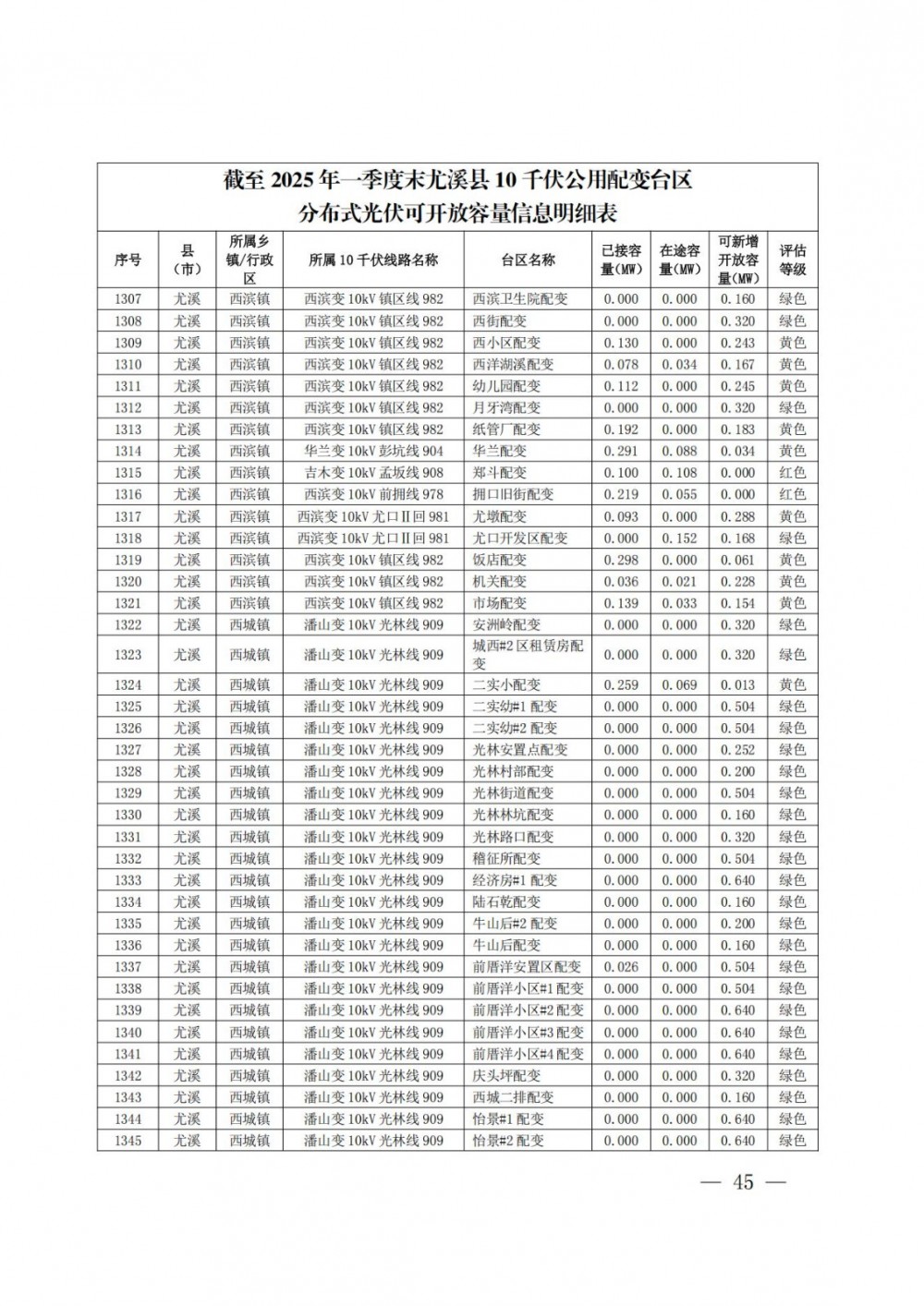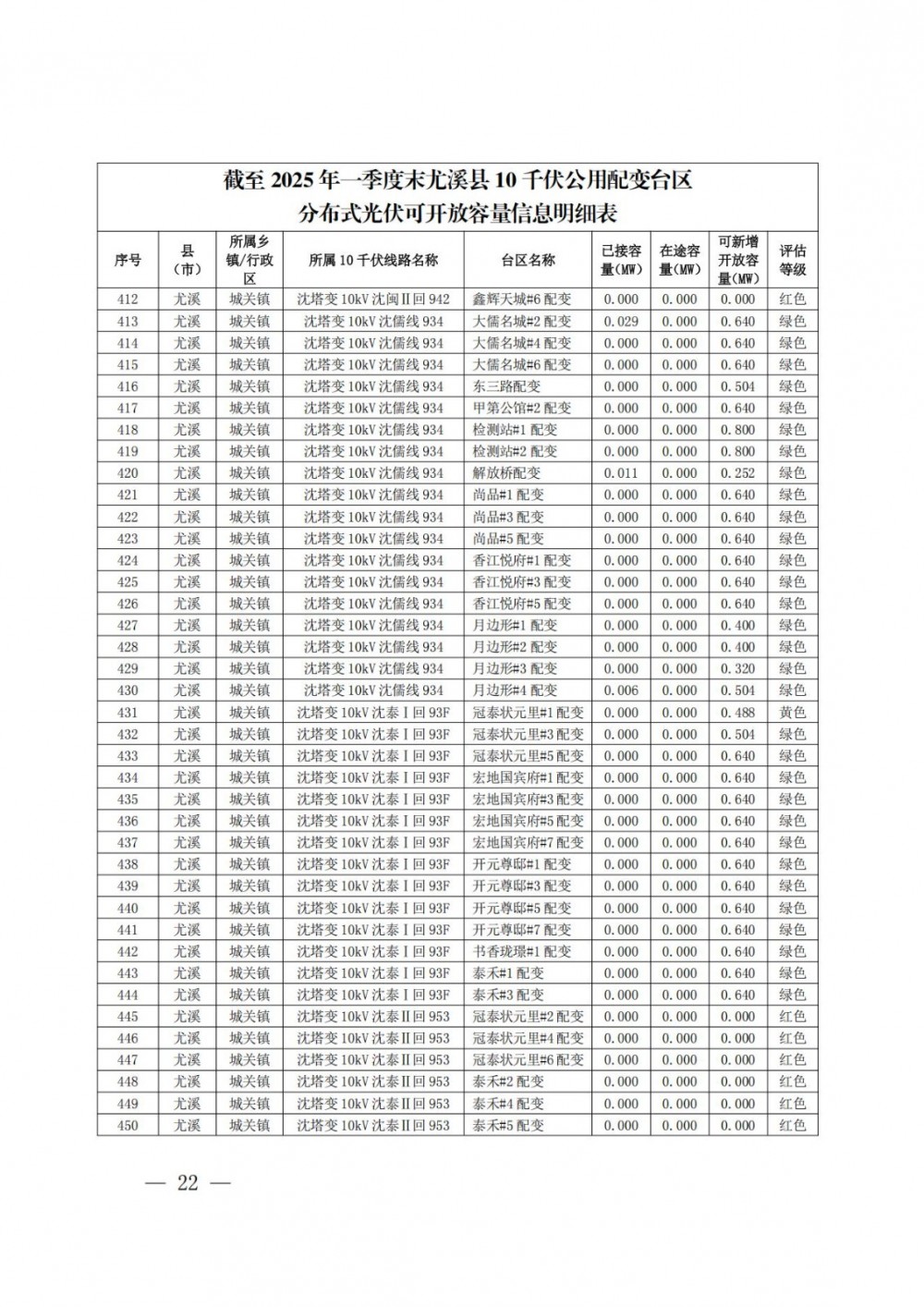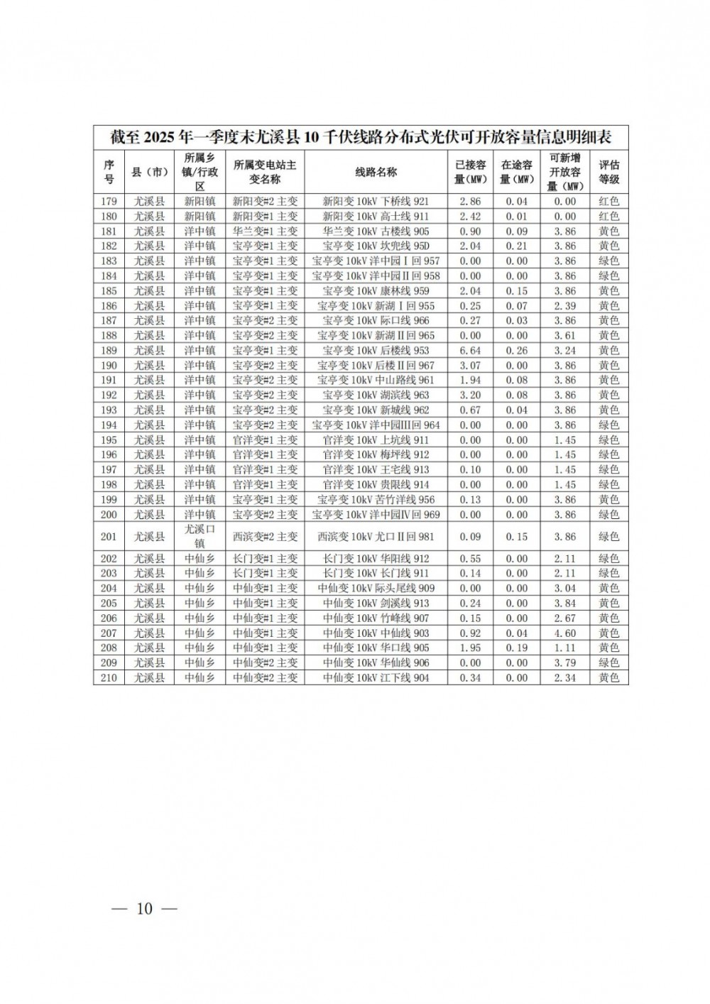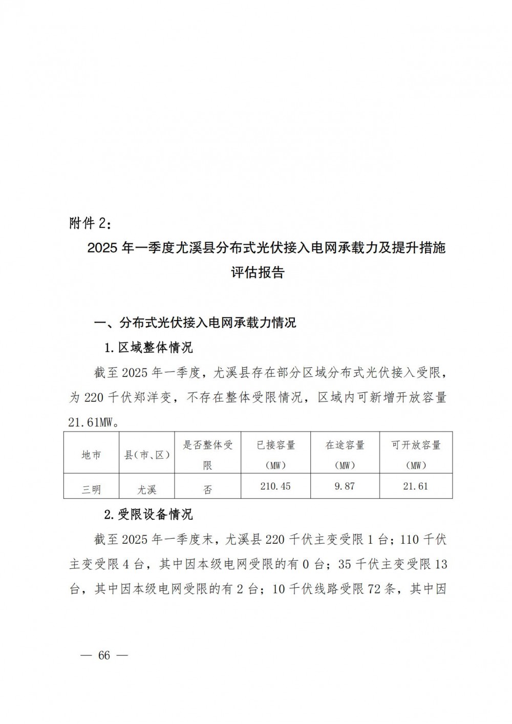 文件表示,国网尤溪县供电公司对分布式光伏接入电网承载力进行评估测算,截至2025年第一季度末尤溪县分布式光伏已接入容量210.45兆瓦,在途容量9.87兆瓦,可新增开放容量为21.61兆瓦。