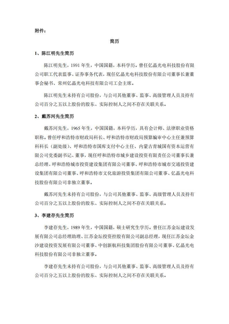 陈江明,1991 年生,中国国籍,本科学历。曾任亿晶光电科技股份有限公司职工代表监事、证券事务代表,现任亿晶光电科技股份有限公司董事长兼董事会秘书、常州亿晶光电科技有限公司工会主席。 陈江明先生未持有公司股份,与公司其他董事、监事、高级管理人员及持有公司百分之五以上股份的股东、实际控制人之间不存在关联关系。