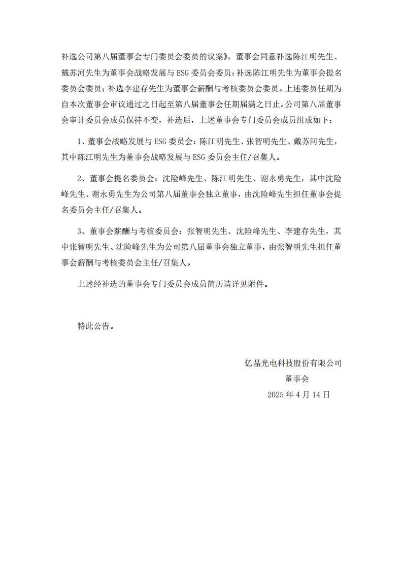 4月14日,亿晶光电发布关于选举第八届董事会董事长及补选董事会专门委员会委员的公告。