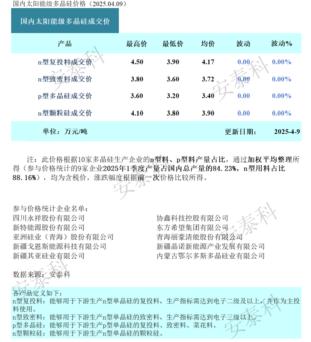 4月9日,硅业分会公布当周最新硅料价格。n型复投料成交价格区间为3.90-4.50万元/吨,成交均价为4.17万元/吨,n型颗粒硅成交价格区间为3.80-4.10万元/吨,成交均价为3.90万元/吨,p型多晶硅成交价格区间为3.20-3.60万元/吨,成交均价为3.40万元/吨。