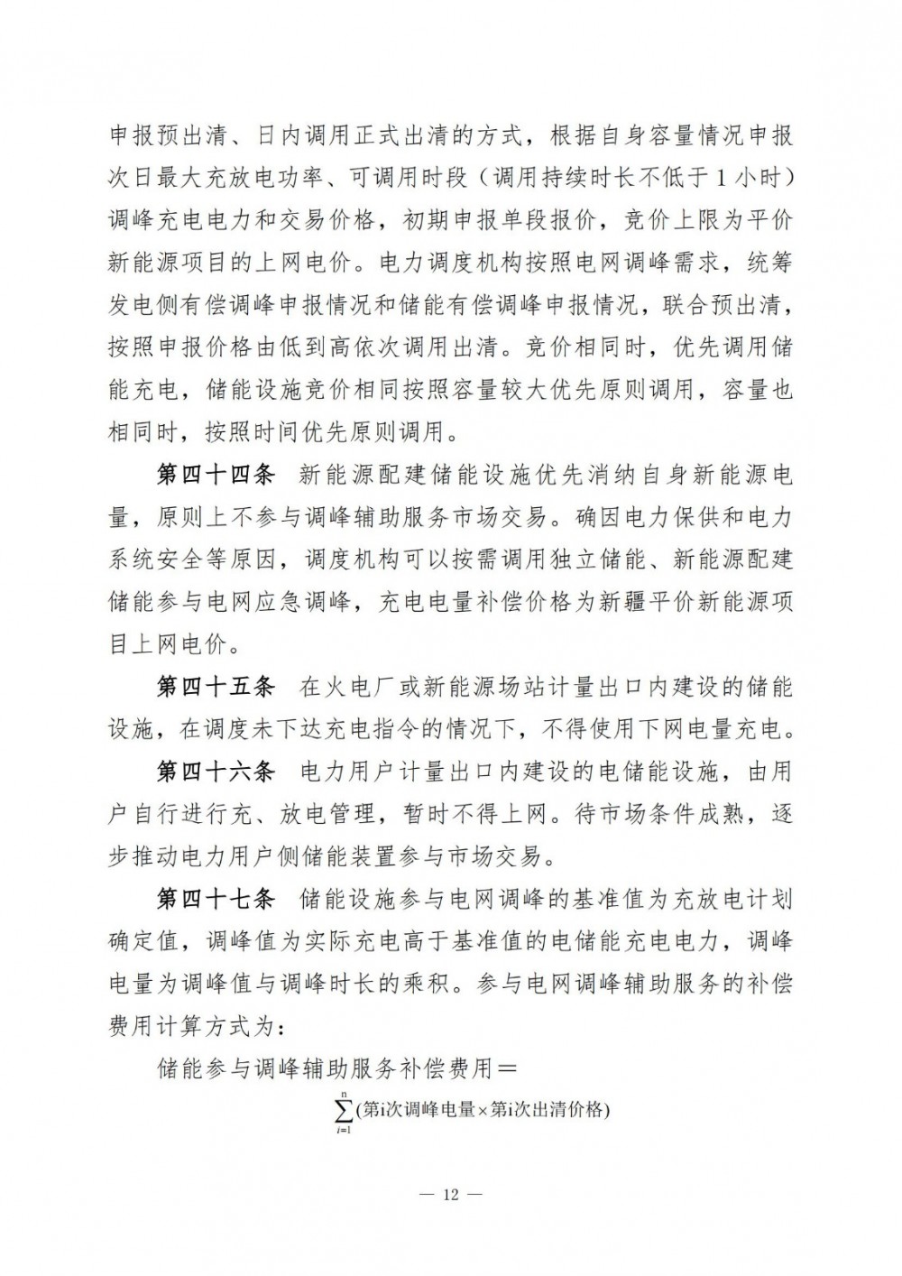 新能源配建储能设施优先消纳自身新能源电量,原则上不参与调峰辅助服务市场交易。确因电力保供和电力系统安全等原因,调度机构可以按需调用独立储能、新能源配建储能参与电网应急调峰,充电电量补偿价格为新疆平价新能源项目上网电价。