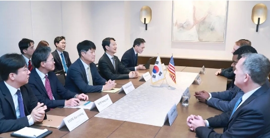 图片说明:美国太平洋能源集团(Pacifico Energy Group)CEO兼董事长威廉内森富兰克林(William Nathan Franklin)向韩国产业通商资源部长官安德根(音译)提交投资报告后合影留念。