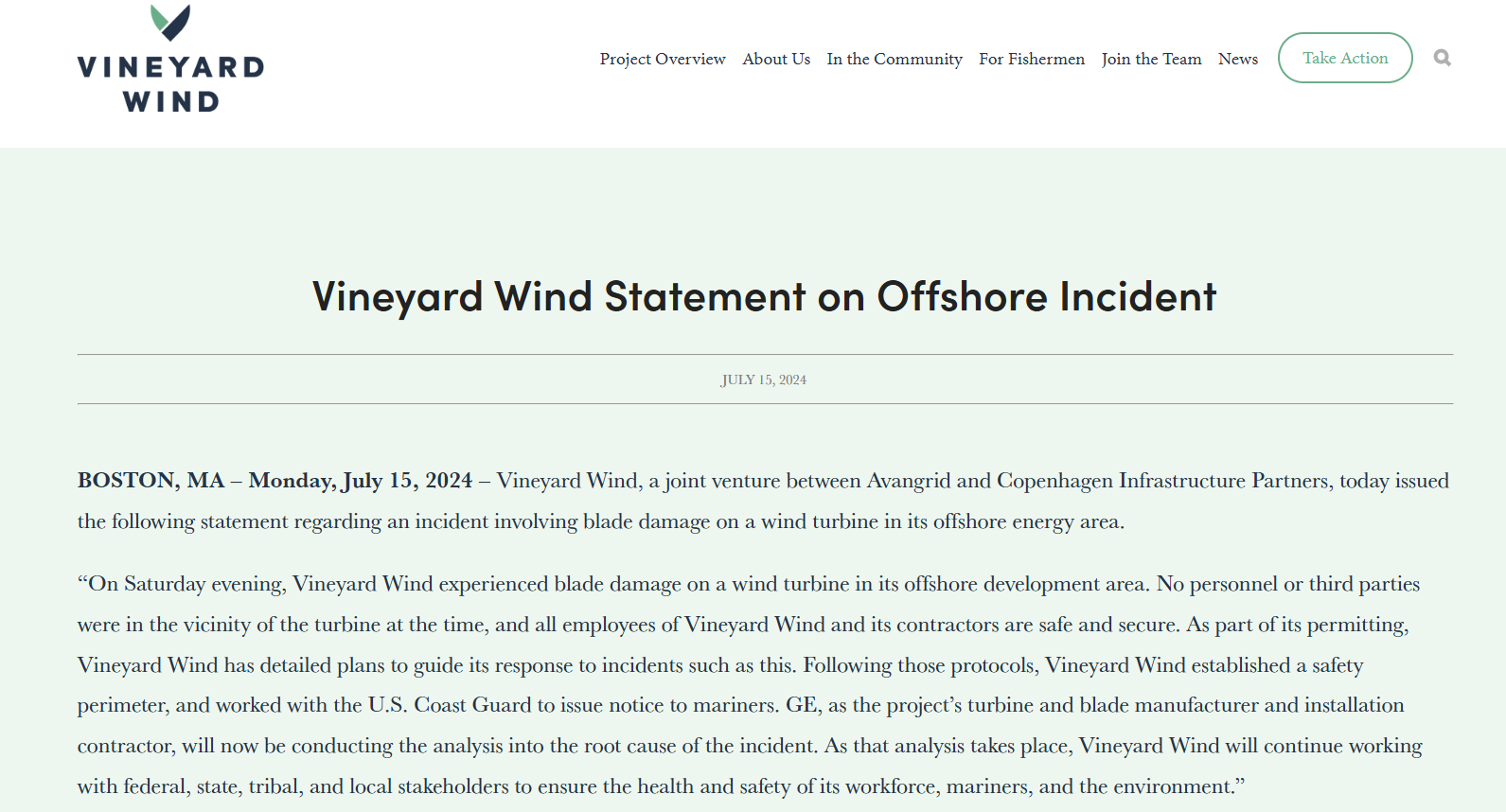 GE作为Vineyard Wind 1项目的海上风机和叶片制造商以及安装承包商,目前正在对事故的根本原因进行调查。在调查过程中,Vineyard Wind将继续与联邦、州、社区和当地利益相关者合作,确保其员工、海员和环境的健康与安全。
