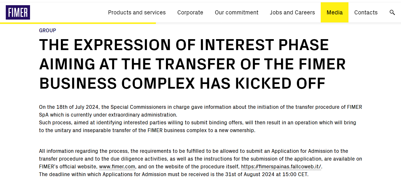 有意向的竞标者可以在 2024 年 8 月 31 日之前表达收购 Fimer 的兴趣。此次交易还将包括 Fimer 的所有厂房、机械设备、库存、证书、房地产,以及意大利集团在 Fimer India Private Limited、Fimer Singapore 等公司持有的外国股权投资。