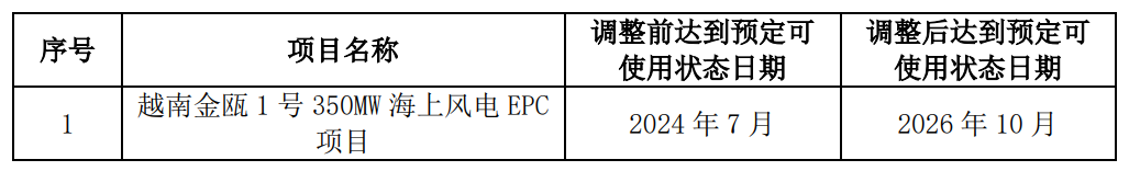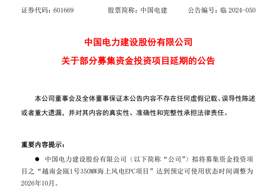 公告披露,中国电建于2024年7月24日召开第三届董事会第八十九次会议、第三届监事会第四十三次会议,审议通过了《关于募集资金投资项目之越南金瓯1号350MW海上风电EPC项目延期的议案》,同意越南金瓯1号350MW海上风电EPC项目达到预定可使用状态的时间延至2026年10月。