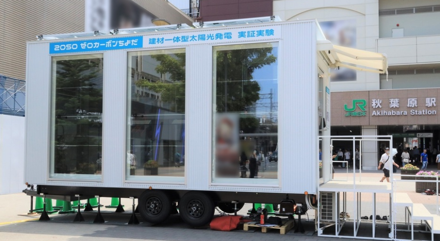 7月25 日,YKK AP在东京秋叶原站前的广场上设置了以现有建筑物的微缩模型建造的示范屋秋叶零盒,并开始了使用钙钛矿太阳能电池的室内窗式建筑材料综合太阳能发电(BIPV)的示范实验。