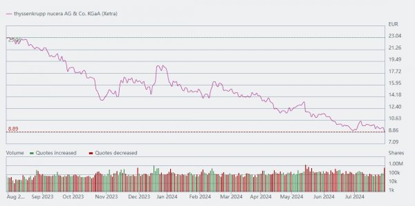 由于监管和融资方面的挑战,蒂森克虏伯新纪元公司(Thyssenkrupp nucera)撤回了2025年绿色氢的目标,导致其股价大幅下跌。尽管电解槽销售强劲,但持续的市场不确定性影响了预测和投资计划,导致未来几年的财务预期降低。