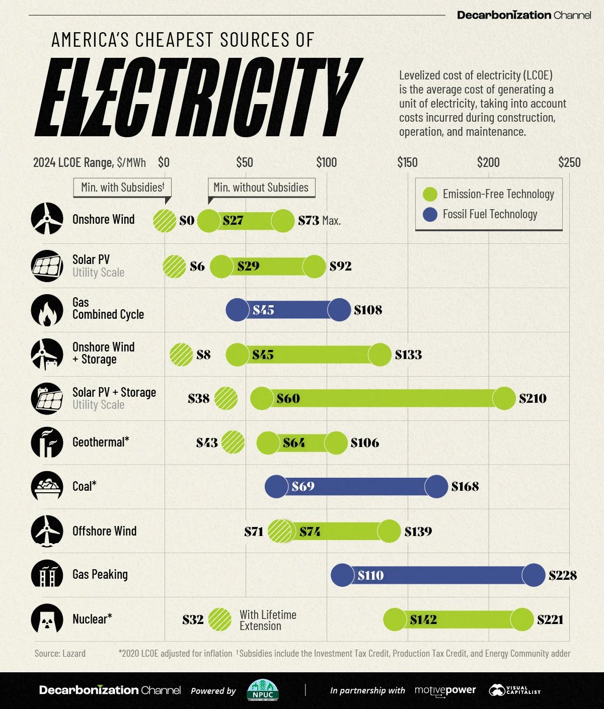 在不断变化的全球能源格局中,可再生能源的成本效益越来越高。即使没有补贴,可再生能源通常也是最便宜的选择。下图综合了Lazard的最新年度度电成本(LCOE)报告中反映的数据,揭示了2024年哪些电力来源最贵、哪些最便宜。