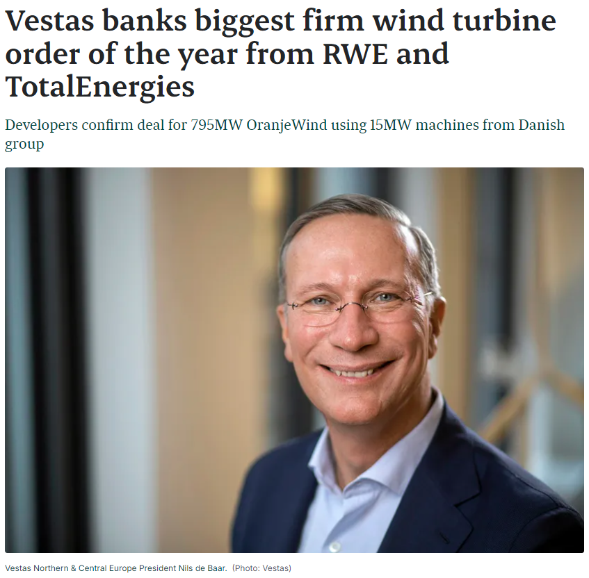 近日,RWE和TotalEnergies确认了荷兰北海795MW OranjeWind海上项目的订单得主,维斯塔斯成功斩获,这也是其今年迄今为止最大的风机订单。