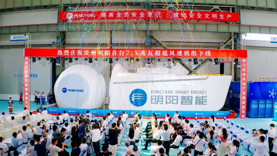 8月26日,贵州明阳首台7.X兆瓦超低风速机组下线仪式暨风电产业链建设招商大会在明阳黔东南基地举行。此次下线的MySE7.X风电机组由明阳智能自主研发,是贵州单机容量最大超低风速机组,对于推动我国大功率低风速风电技术创新、拓展贵州风能开发利用空间具有里程碑意义。该台风机也是明阳黔东南基地正式投产下线的首台风机,标志着明阳作为链主企业助力贵州风电产业集群建设迈出关键一步。