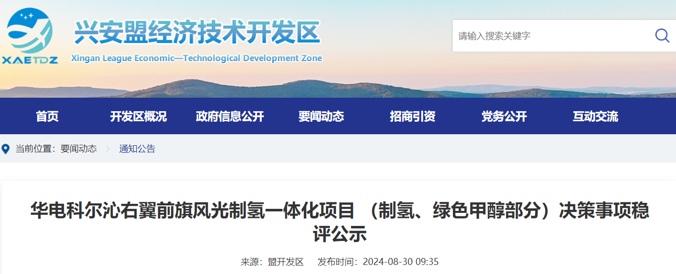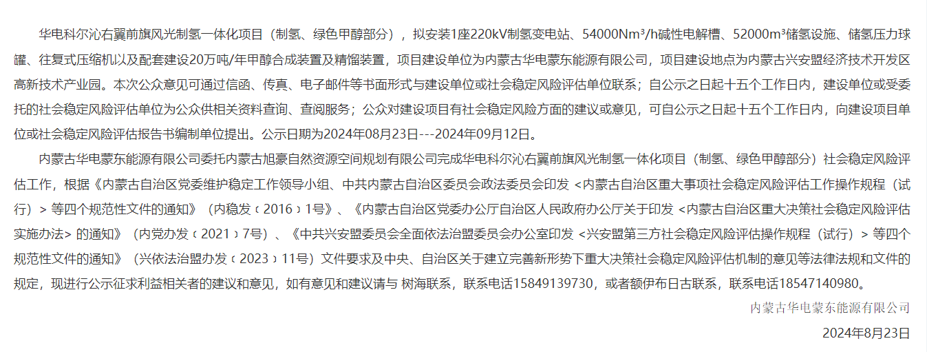 8月30日,兴安盟经济开发区官网发布华电科尔沁右翼前旗风光制氢一体化项目 (制氢、绿色甲醇部分)决策事项稳评公示。