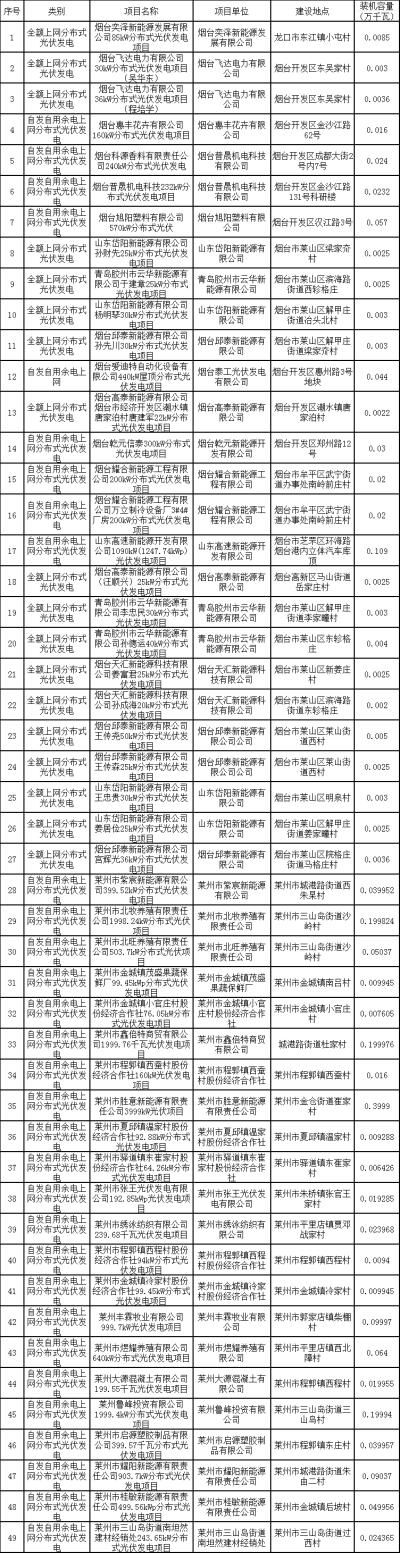 按照省发展改革委、省能源局《关于推进风电、光伏发电无补贴平价上网项目建设的通知》(鲁发改能源〔2019〕367号)有关要求,经审核烟台奕泽新能源发展有限公司85kW分布式光伏发电项目等49个项目符合平价上网条件,现予以公布。