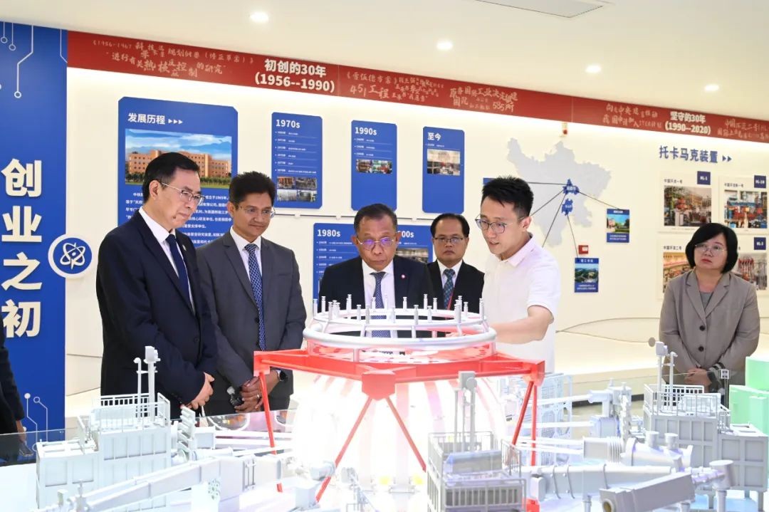 会议期间,多国代表团先后赴西物院参观访问,深入新一代人造太阳中国环流三号装置现场,详细了解聚变科研进展。6月 10 日,印尼国家研究与创新署(BRIN)主席拉克萨纳・特里・翰多科率团到访西物院,并听取了西物院近期取得的重大科技创新成果汇报。次日上午,马来西亚国油科技大学校长穆罕默德菲鲁兹阿兹南先生一行赴西物院参观,双方就聚变人才培养、聚变装置建设等合作内容展开深入交流,为中马聚变合作从概念构想迈向落地实施奠定坚实基础。6月12日,马来西亚科技与创新部部长郑立慷、泰国高等教育科学研究与创新部副部长苏帕差杰穆分别率团赴西物院参观,围绕磁约束聚变能领域人才培养、联合科研攻关、技术交流合作机制进行座谈交流,并就进一步加强协同创新、推动能源技术发展交换了意见。