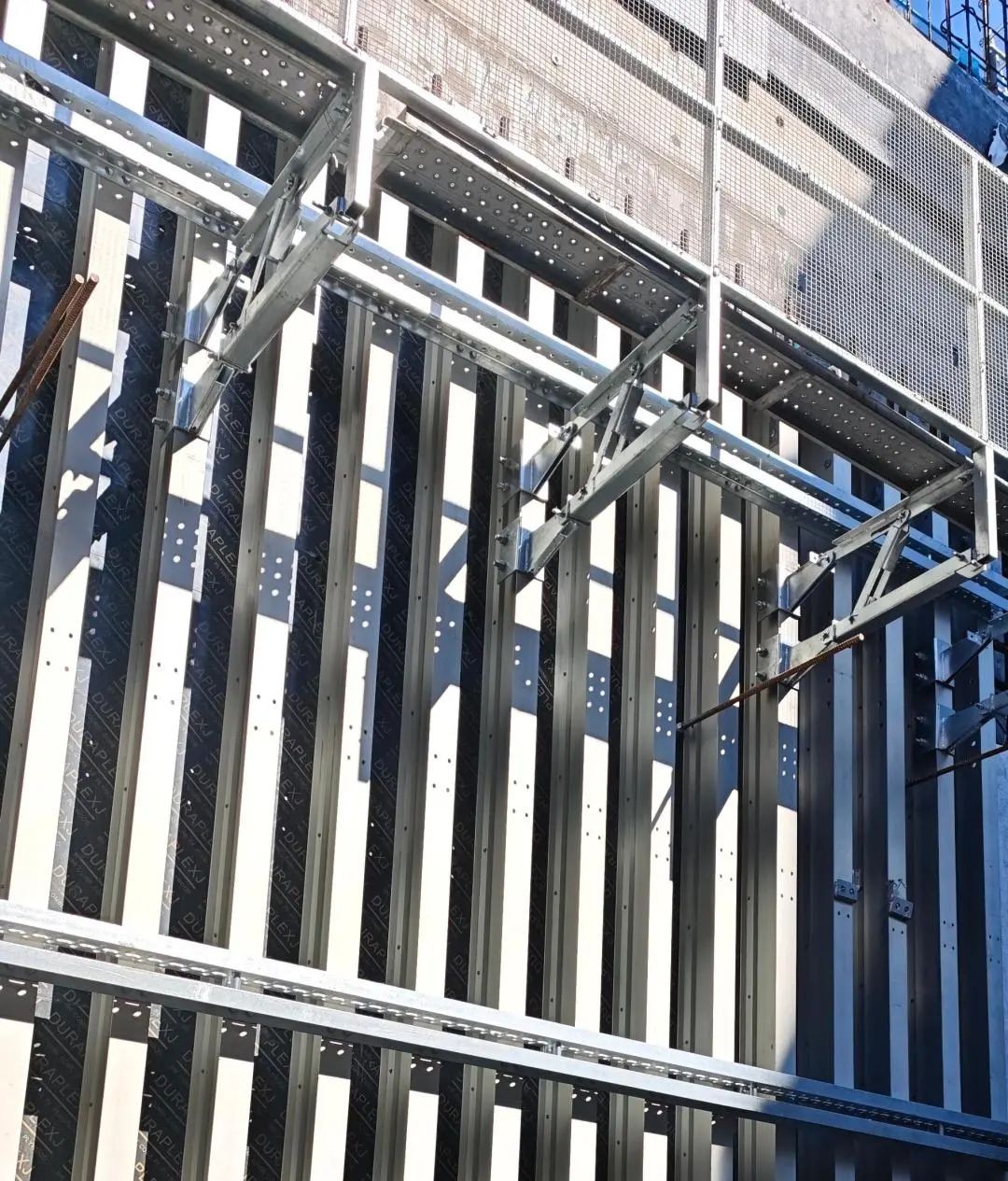 陆丰核电1、2机组应用的4880*5800*18规格大模板体系优势显著。该体系凭借标准化大尺寸设计,大幅压缩材料拼装耗时达50%,有效提升施工效率;同时,其良好的整体性减少了生产过程中的材料损耗,实现施工成本的降低。在龙骨与支撑结构设计上,大模板横向配置3道双14槽钢龙骨,竖向采用间距300的H20铝工字梁。经严谨力学计算验证,3道双14槽钢龙骨即可满足受力需求,相比传统方案有效减少槽钢用量,简化拼装流程;而H20铝工字梁的应用,不仅增强了大模板体系的安全性,更显著提升其整体刚度与稳定性,在保障工程质量的同时,实现了材料成本与施工难度的双重优化。