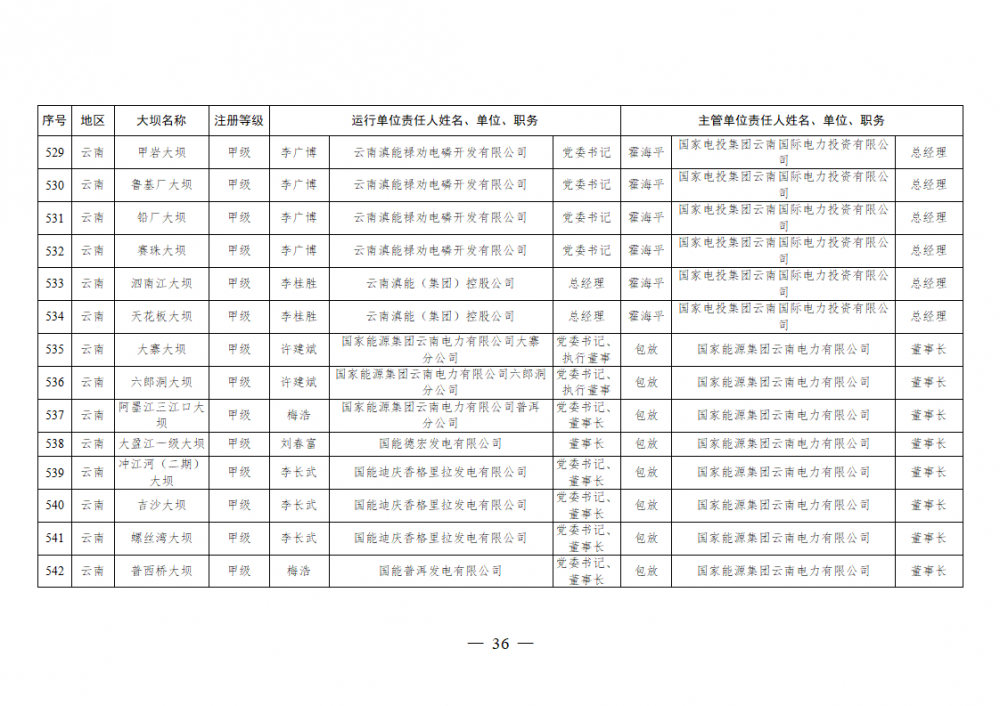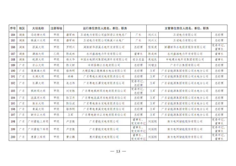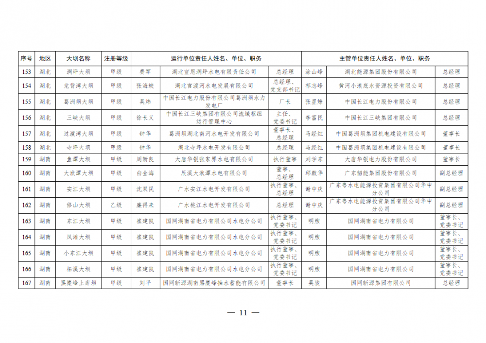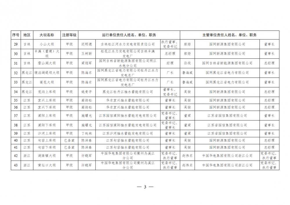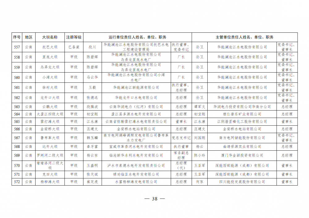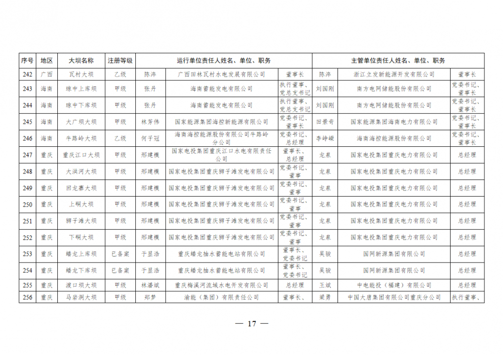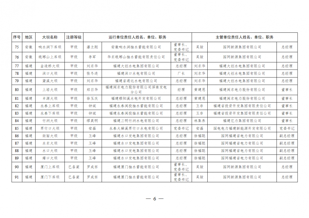 为进一步加强水电站大坝安全监督管理,压紧压实电力企业大坝安全主体责任,按照《水库大坝安全管理条例》《电力安全生产监督管理办法》(国家发展改革委令2015年第21号)、《水电站大坝运行安全监督管理规定》(国家发展改革委令2015年第23号)等规定要求,现将电力行业700座注册登记和登记备案的水电站大坝(以下简称大坝)运行单位及主管单位的安全责任人名单予以公布。
