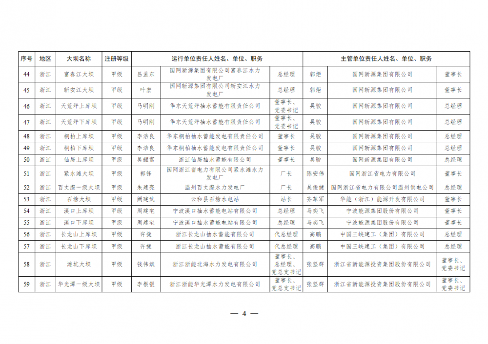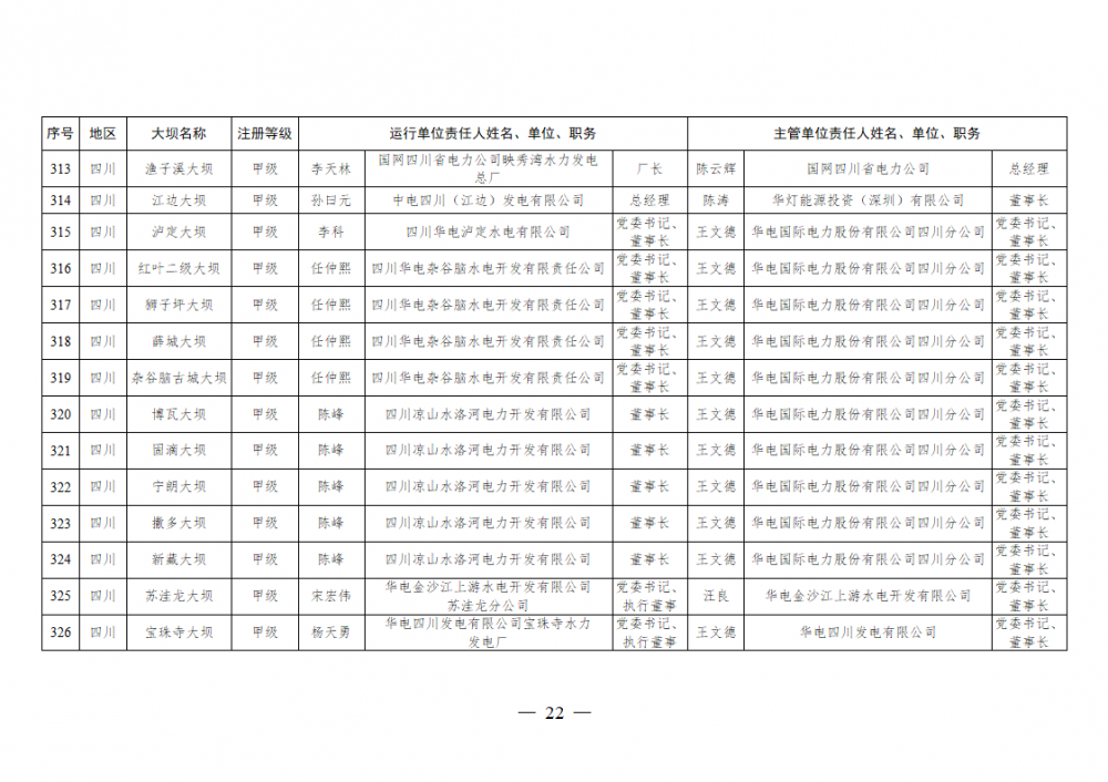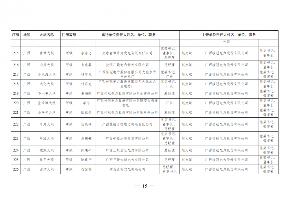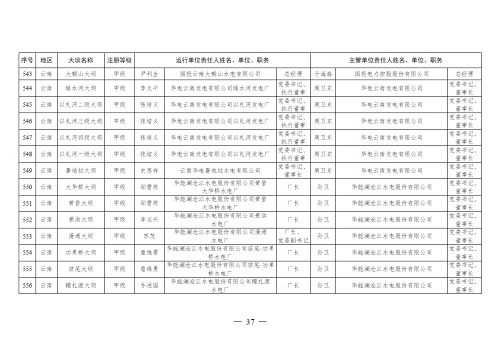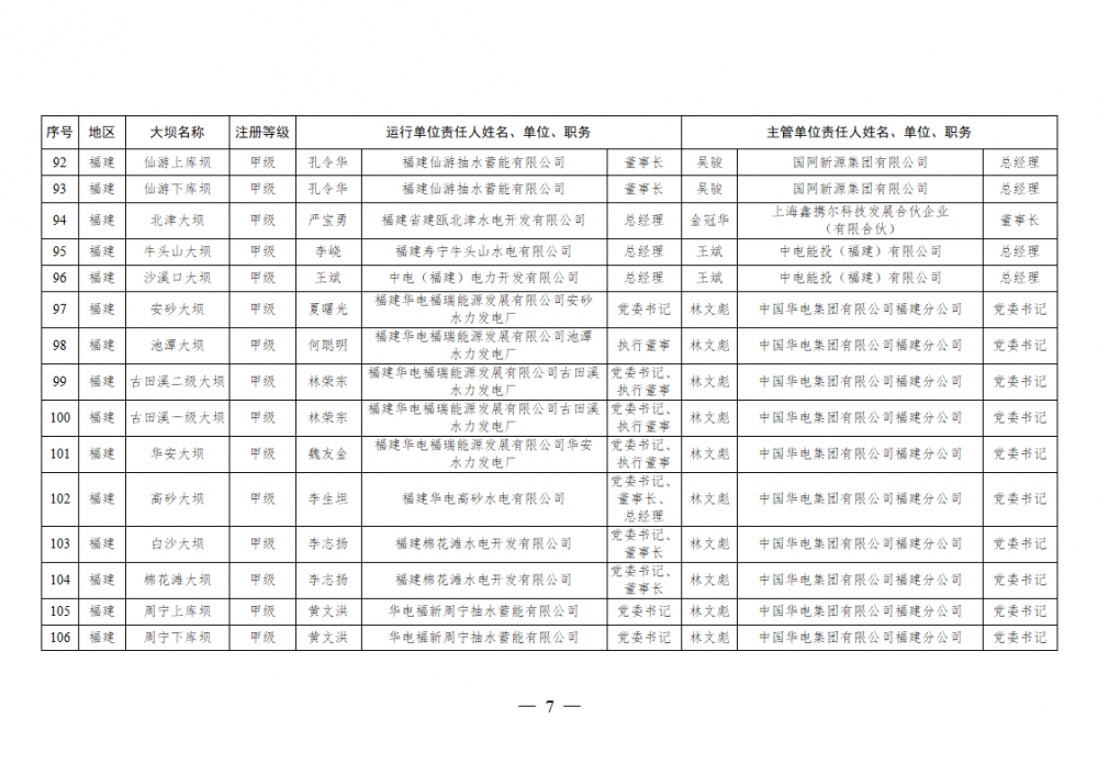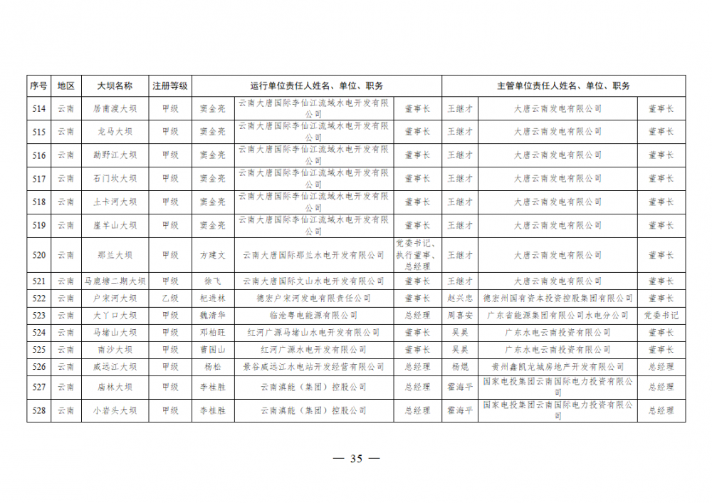 为进一步加强水电站大坝安全监督管理,压紧压实电力企业大坝安全主体责任,按照《水库大坝安全管理条例》《电力安全生产监督管理办法》(国家发展改革委令2015年第21号)、《水电站大坝运行安全监督管理规定》(国家发展改革委令2015年第23号)等规定要求,现将电力行业700座注册登记和登记备案的水电站大坝(以下简称大坝)运行单位及主管单位的安全责任人名单予以公布。