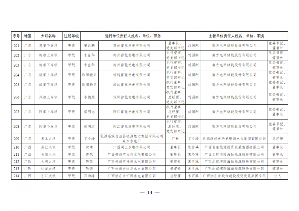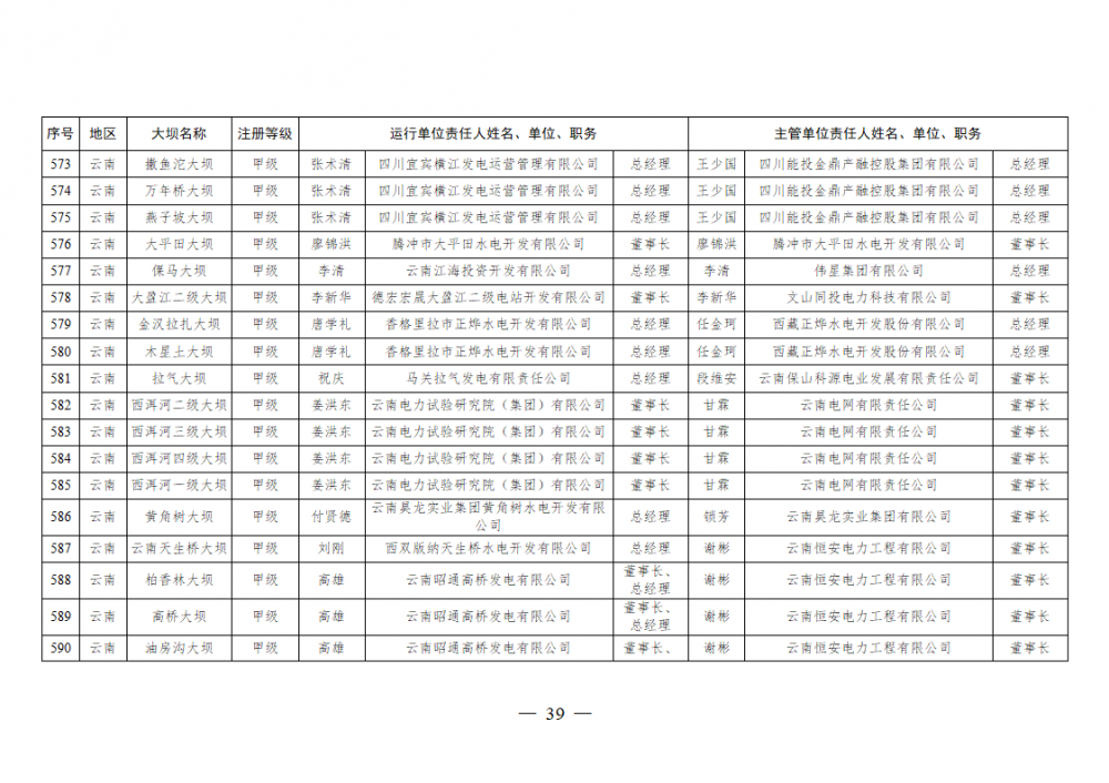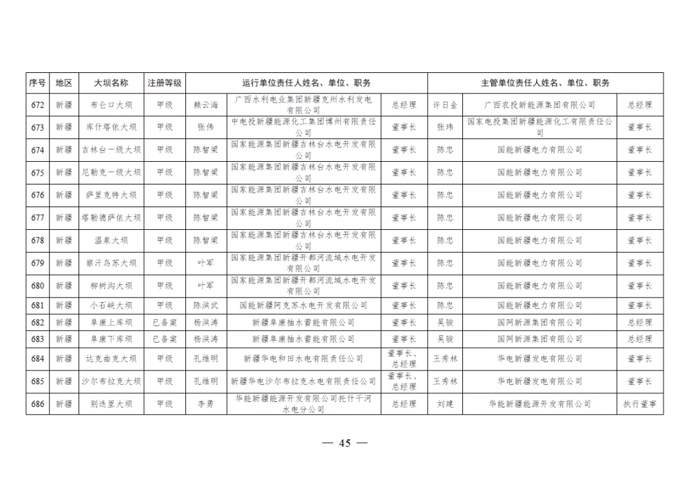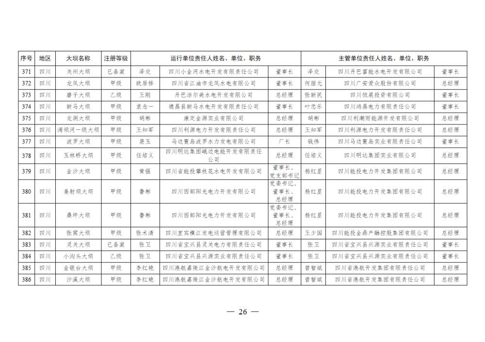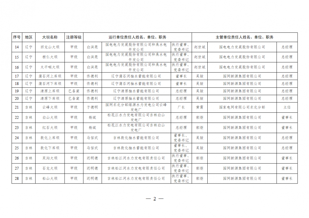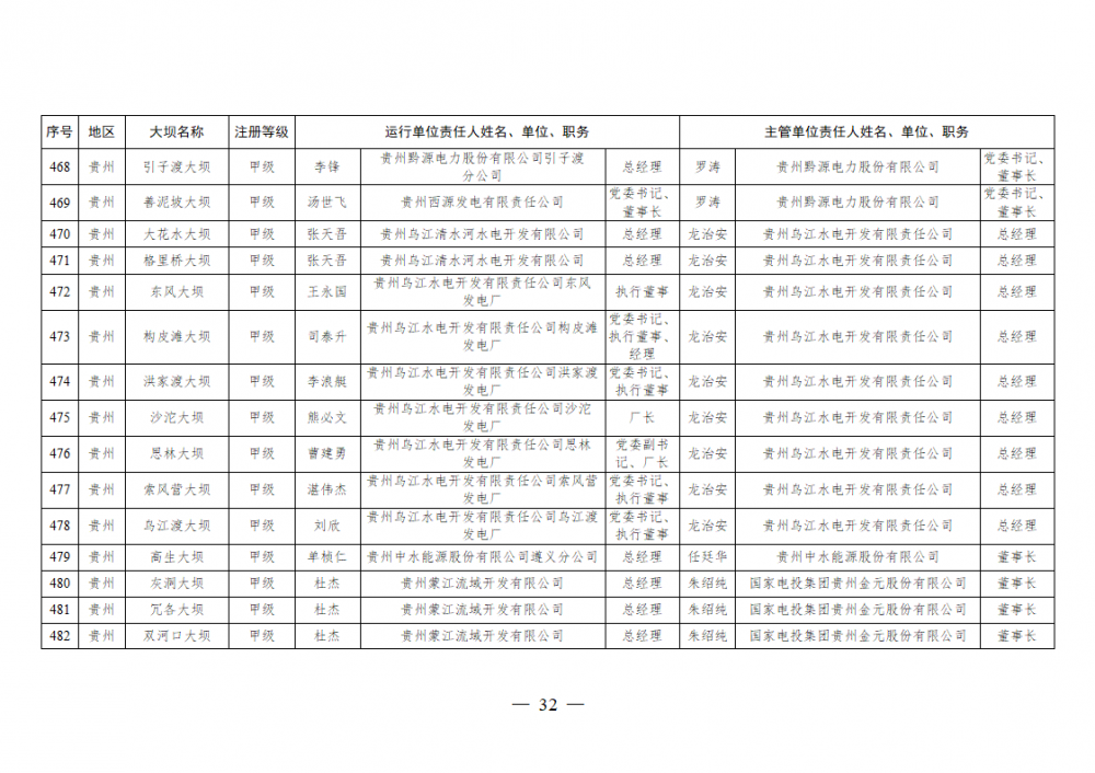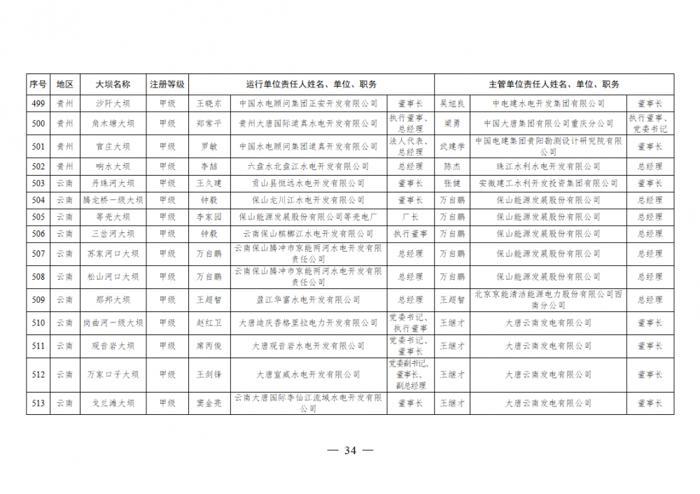为进一步加强水电站大坝安全监督管理,压紧压实电力企业大坝安全主体责任,按照《水库大坝安全管理条例》《电力安全生产监督管理办法》(国家发展改革委令2015年第21号)、《水电站大坝运行安全监督管理规定》(国家发展改革委令2015年第23号)等规定要求,现将电力行业700座注册登记和登记备案的水电站大坝(以下简称大坝)运行单位及主管单位的安全责任人名单予以公布。