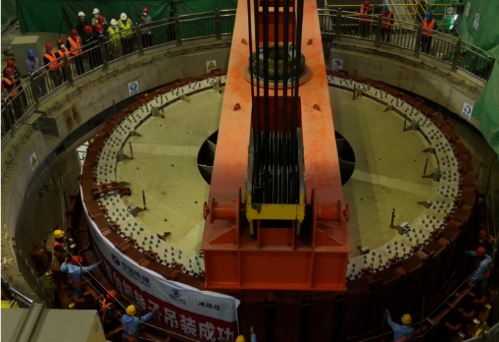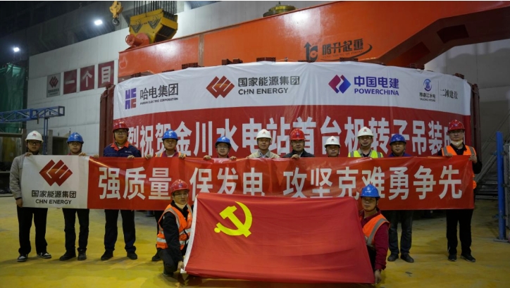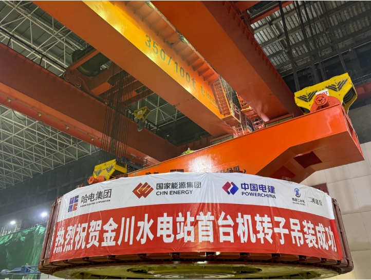5月20日,大渡河金川水电站4号机组转子顺利完成吊装并与主轴精准对接,标志着机组核心机电设备安装迈入关键攻坚阶段,为2025年首台机组投产发电目标奠定坚实基础。