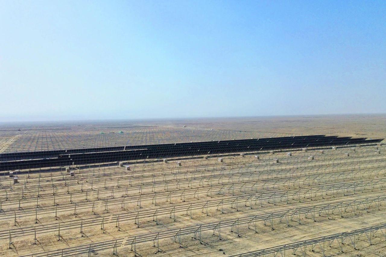 这座占地1.7万亩的新能源基地,装机容量达50万千瓦,年均可输送9.25亿度清洁电能,相当于可为华北地区11万户家庭提供全年用电,每年减少的二氧化碳排放量等同于种植400万棵胡杨林。