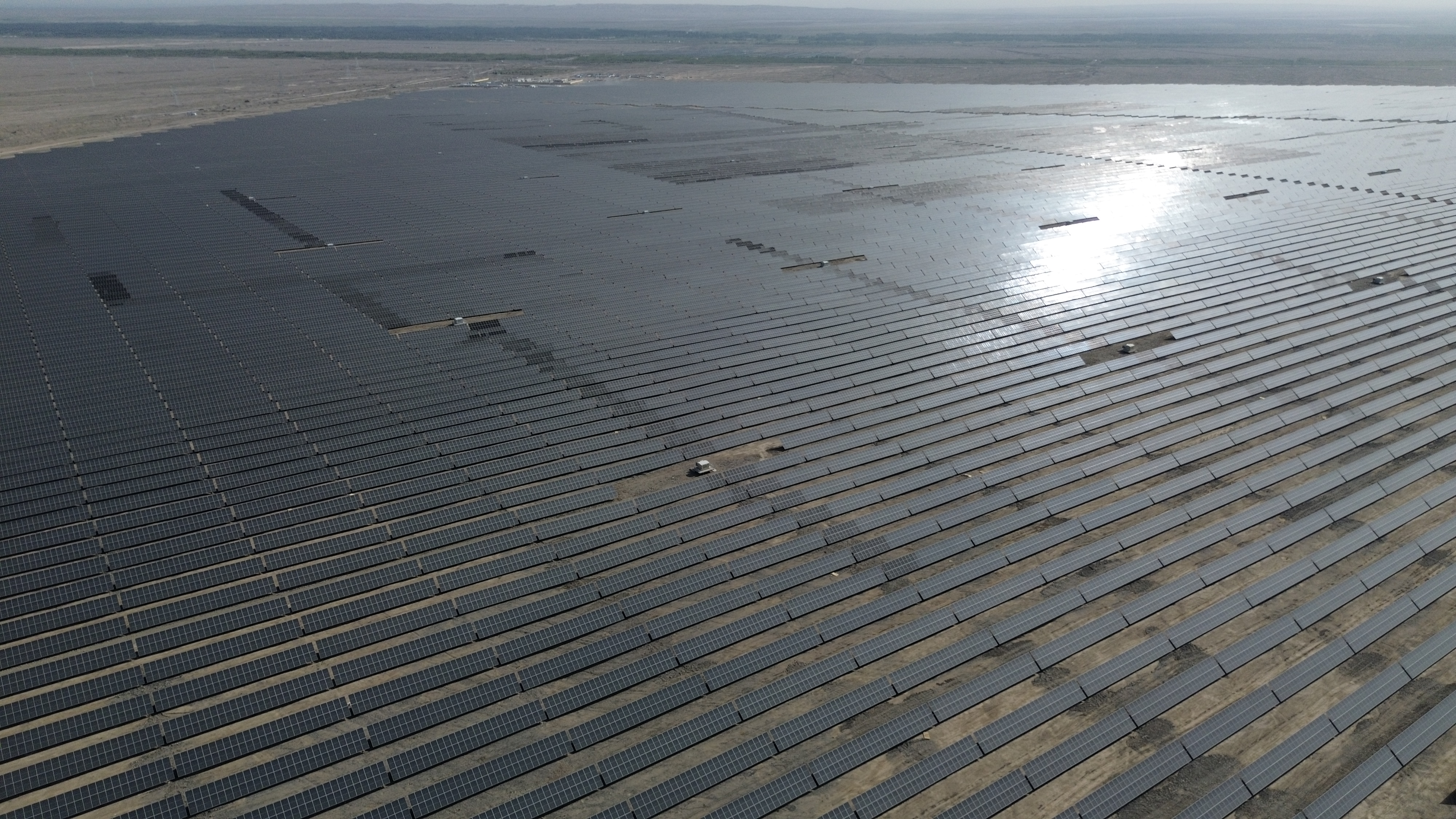 放眼望去,近20万块光伏板在1.7万亩的广袤戈壁上整齐铺展,构成一片蔚为壮观的“蓝色方阵”,在炽烈阳光的照射下熠熠生辉,成为塔克拉玛干沙漠西缘一道亮丽的风景线。葛洲坝路桥公司的追光者们战风沙、斗酷暑,在荒芜戈壁中描绘出一幅壮丽的绿色画卷。