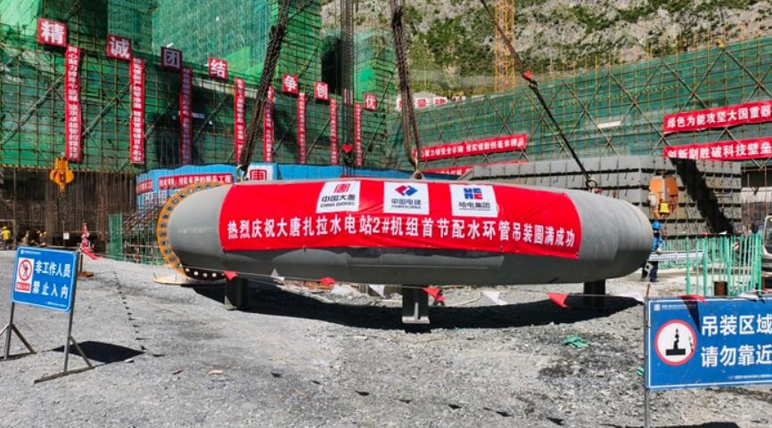9月4日,由哈电集团电机公司生产的大唐扎拉水电站2号机组配水环管首节吊装顺利完成。