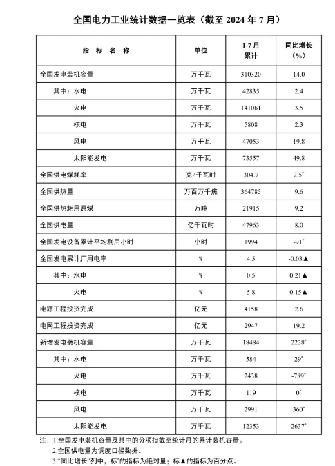 8月23日,国家能源局发布1-7月份全国电力工业统计数据。截至7月底,全国累计发电装机容量约31.0亿千瓦,同比增长14.0%。其中,太阳能发电装机容量约7.4亿千瓦,同比增长49.8%;风电装机容量约4.7亿千瓦,同比增长19.8%。1-7月份,全国发电设备累计平均利用1994小时,比上年同期减少91小时。1-7月份,全国主要发电企业电源工程完成投资4158亿元,同比增长2.6%。电网工程完成投资2947亿元,同比增长19.2%。