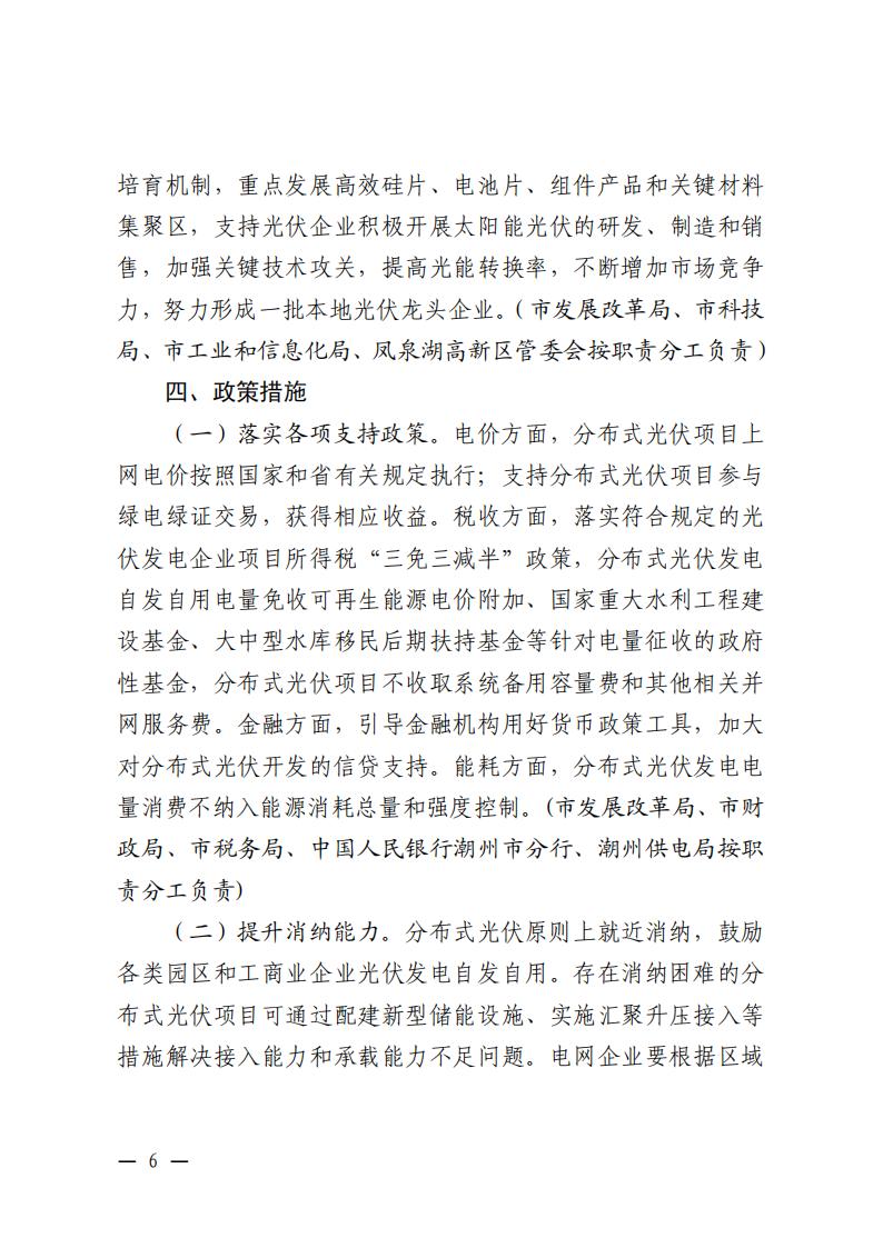 文件明确,电价方面,分布式光伏项目上网电价按照国家和省有关规定执行;支持分布式光伏项目参与绿电绿证交易,获得相应收益。税收方面,落实符合规定的光伏发电企业项目所得税三免三减半政策,分布式光伏发电自发自用电量免收可再生能源电价附加、国家重大水利工程建设基金、大中型水库移民后期扶持基金等针对电量征收的政府性基金,分布式光伏项目不收取系统备用容量费和其他相关并网服务费。金融方面,引导金融机构用好货币政策工具,加大对分布式光伏开发的信贷支持。能耗方面,分布式光伏发电电量消费不纳入能源消耗总量和强度控制。