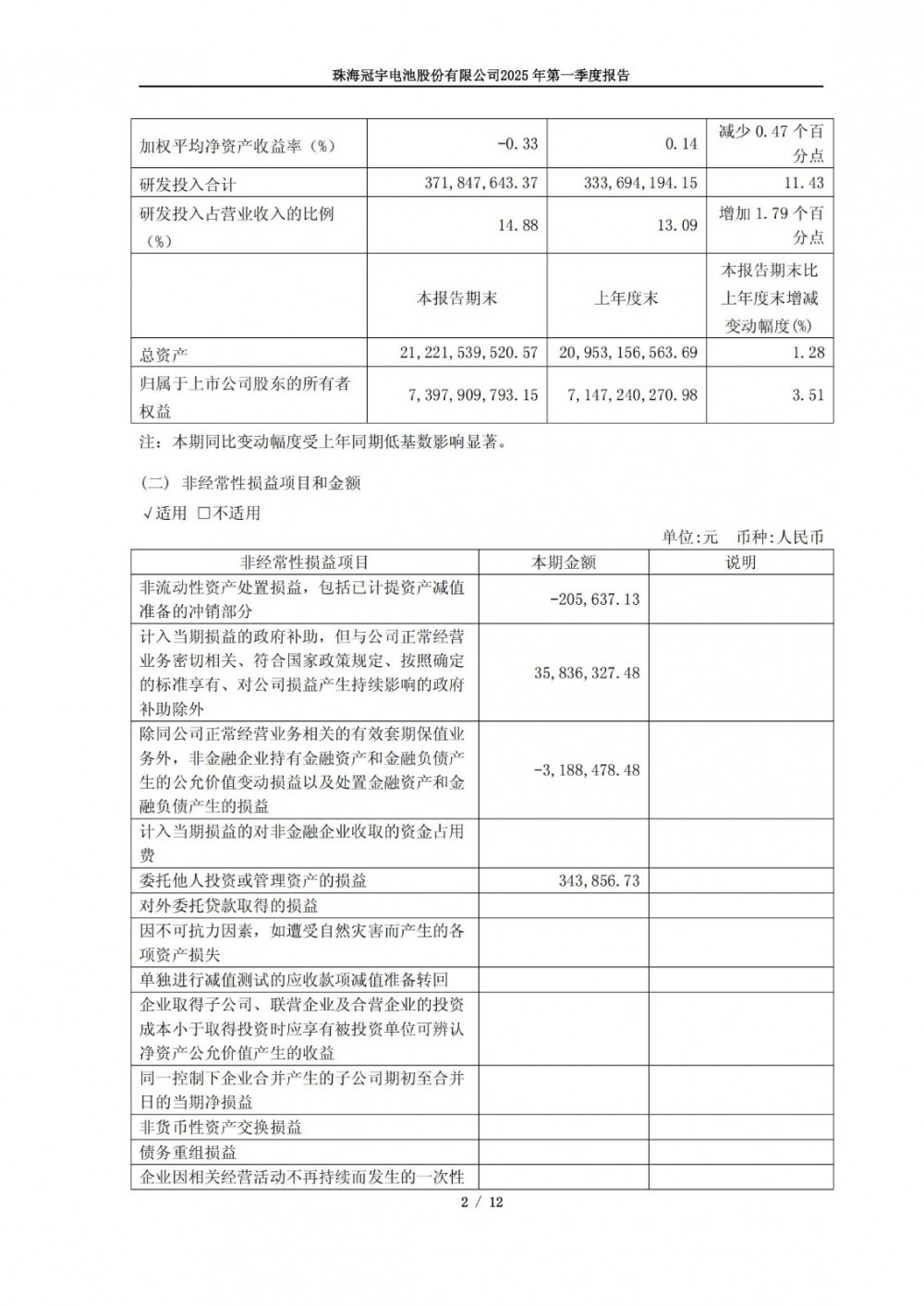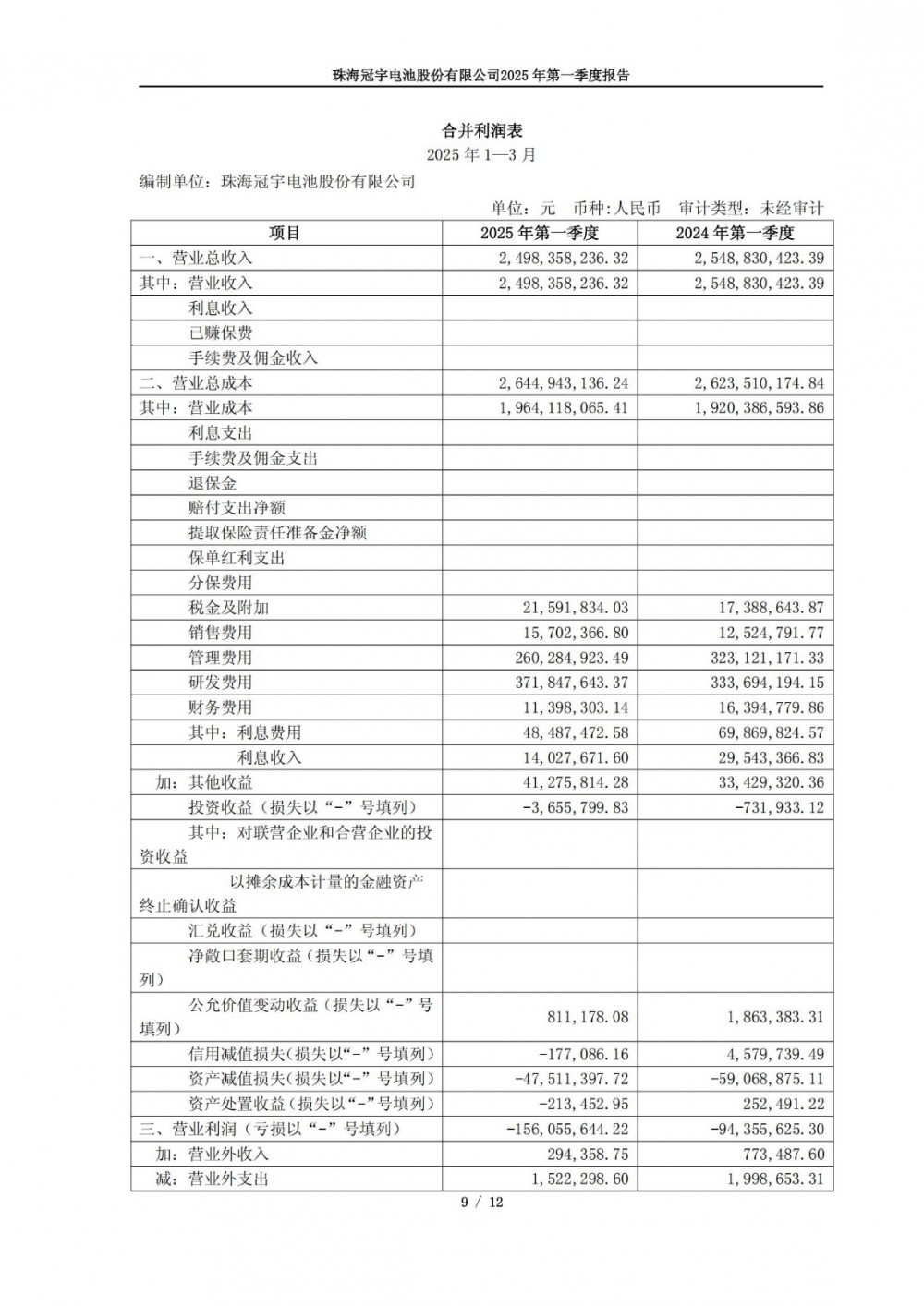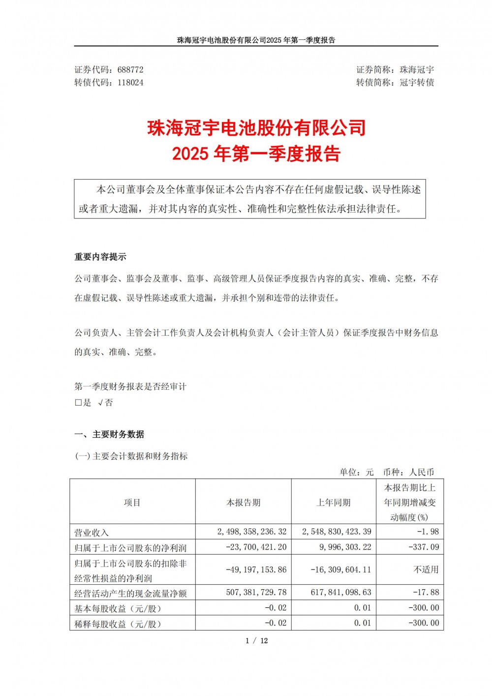 2025年一季度,珠海冠宇实现营业总收入24.98亿元,同比上涨1.98%;归母净利润亏损2370.04万元,同比下降337.09%;扣非净利润亏损4919.72万元,上年同期亏损1630.96万元。